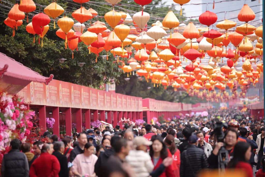 花市以「騏驥灣區,繁花福田」為主題,佔地2.4萬平方米,規模盛大。其最大魅力在於無界融合:頂級年花旁可能是可口可樂、國家地理、瘋狂動物城的跨界展位;挑選盆栽時,可能會邂逅非遺大師展演或收到AI機器人的拜年祝福。國風巡遊、漢服打卡、智能飛碟、VR穿越與街舞說唱在此混搭上演,呈現出一場極具國際視野與年輕活力的新春嘉年華,精准詮釋了深圳開放、創新的城市氣質。