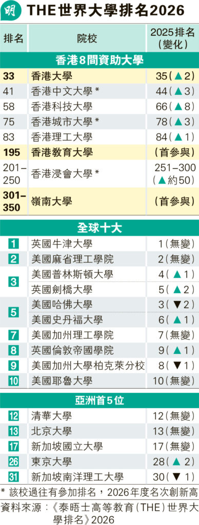 英国《泰晤士高等教育》(THE)今日公布2026年度世界大学排名,本港续有5所大学位列全球百强,排名均升,其中香港大学位列第33名,按年升两位,蝉联本地大学之首,亦是亚洲第6、全国第3位。中大、城大、浸大排名创该校新高,教大和岭大首上榜(见图)。THE回复本报称,港8所资助大学的国际化表现出众,归因各校招揽大量来自内地的学生和教职员。