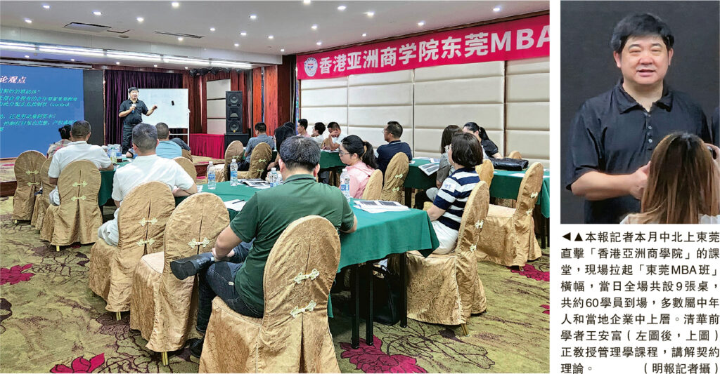 记者本月中直击“香港亚洲商学院”(简称亚商)东莞教学点,其“大陆管理中心”与东莞分校均位于东莞天安数码城商厦群,前者为独立办公单位,后者与两家科技公司共用空间,门口及墙壁张贴香港商标注册证书等宣传材料,宣称是“香港特区政府批准成立的商学院”。因无校舍,亚商定期租借酒店宴会厅授课,记者旁听当日,东莞新城国际酒店宴会厅内悬挂“香港亚洲商学院东莞MBA班”横幅,讲台贴有校徽,职员在门口协助学员签到,并提醒缺勤会“扣分”。