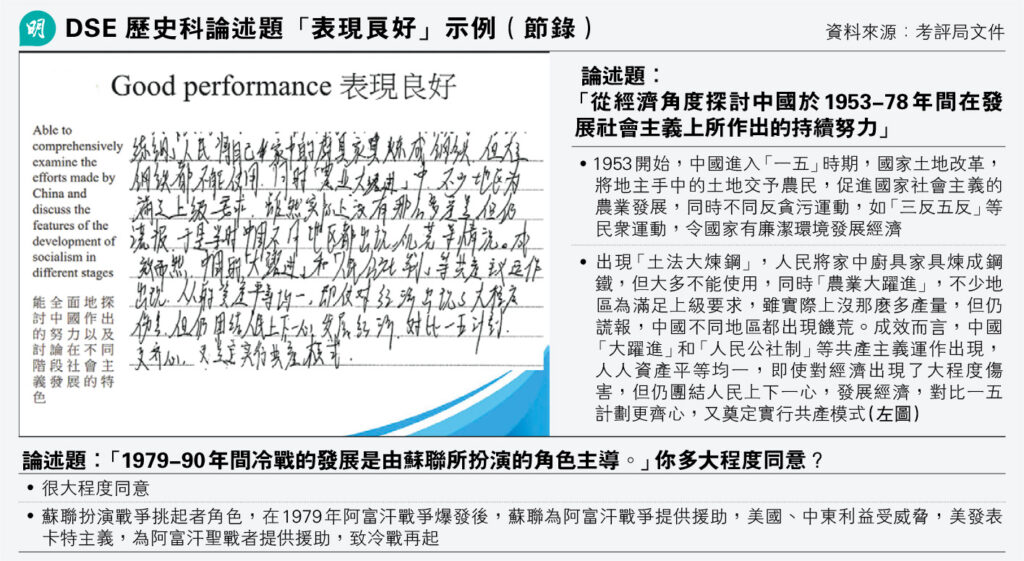 考评局简报形容该考生“能全面探讨中国作出的努力及讨论在不同阶段社会主义发展的特色”。顺德联谊总会郑裕彤中学历史教师卓晓婷估计该作品达第5级,称该考生均匀、饱满地阐述了1953至1978年间各个时期的不同情况,并紧扣经济角度作答,虽然列举的史实不算“超丰富”,但提到了各时期的措施对下一时期发展的影响。