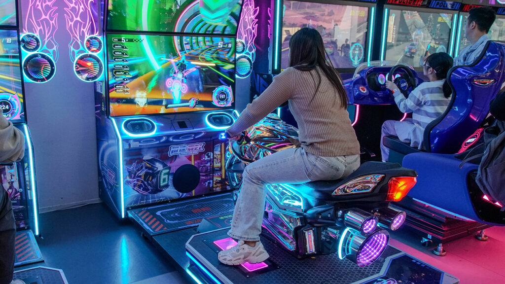 在一楼的跃动格子区域,大人与小朋友在红绿蓝格子的闪烁空间内不停跳跃、奔跑、躲避,进行闯关冒险,亲子游玩过程乐也融融。除了跃动格子外,据企划部负责人黄镒杰透露,「玩美攻略还有不少新设施、新游戏。」例如电玩区配置了新设备,有极品飞车、闪电摩托、狂野飙车9、头文字D等竞速游戏,其中的极速霓虹,采用上下双屏的设计,配以酷炫的摩托装置,玩家在竞速过程中的每次碰撞,下方的体感平台即时给予震动回馈,营造出真实畅快的竞速体验。
