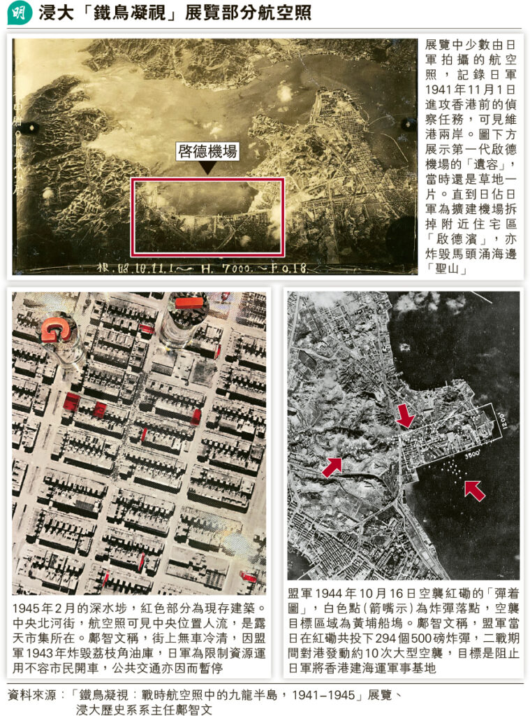 “铁鸟凝视:战时航空照中的九龙半岛,1941-1945”展览的百张照片记录日占时期的深水埗、九龙城和油尖旺,由盟军和日军在2.7万至3万英尺高空拍摄,现于饶宗颐文化馆、中电钟楼文化馆和广华医院展出。展览获政府保育历史建筑基金资助,公众可免费入场。